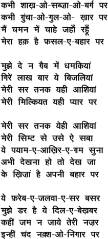% Transliterator: K Vijay Kumar % shaaKh-o-sabzaa-o-barg = branch and verdure and leaf % Gu.nchaa -o - gul-o- Khaar = bud and flower and thorn % fasal-e-bahaar = season of spring % gaib = invisible; the future % sar tanak = head to toe % milkiiyat = possesion % simt = direction; sabaa = gentle breeze % payaam-e-aakhire = final message % khizaa.n = decay % pharebe jalwaae sar basar = illusion % phareb = deceit; sar basar = entirely % naqash-o-nigaar = embellishments; decorations