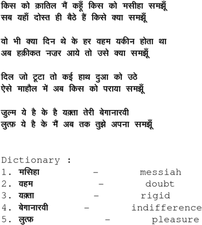 kisako qaatil mai.n kahuu.N kis ko masihaa samajhuu.N