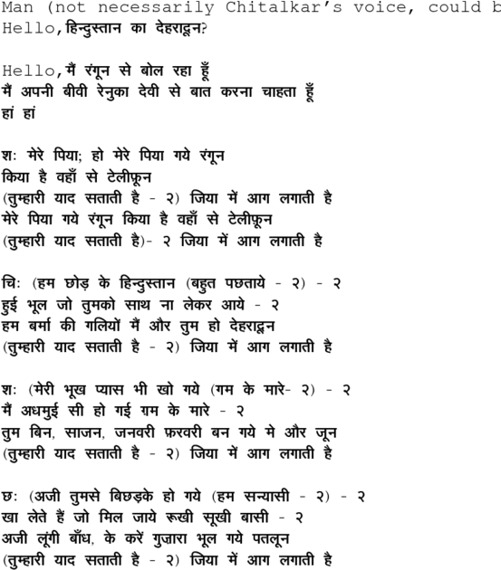 % Transliterator: Ravi Kant Rai (rrai@plains.nodak.edu) % Editor: Anurag Shankar (anurag@chandra.astro.indiana.edu) % Comments: a stage: Man on telepone; Burmese backdrop; man is surrounded % by slim dancing Burmese beauties. Other half of stage, lady on % telephone; empty residential street backdrop.