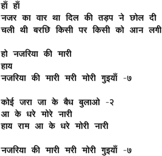 % During the decade long shooting of this film, after the demise % of Ghulam Mohammed, Naushad has composed the remaining % scores of this film including three classical songs which play % in the background at several places. % Only mukha.Daa plays when girls are doing riyaaz. % Saahebjaan (Meena Kumari)'s aunty (Veena)'s sister informs % her about the purchase of Gulaabii mahal. Thenafter, % Meena and Nadira (Gauharjaan) go outing, and then % "Thaa.De rahiyo" begins.
