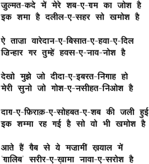 % Song Courtesy: http://www.indianscreen.com % Credits: Afzal A Khan % Normally, each sher in a ghazal has little or no connection % with others. But this ghazal is a very notable exception. % Here, not only does a single theme run throughout the % ghazal, but there are seven shers which are called % "qit'a~baNd", i.e. having a common link. The ghazal has % a total of 13 shers. "Zulmat~kade men mere..." is the % first sher or the "matla'". Including the "matla'", % there are five shers that precede the "qit'a". Ghazal - % singers usually include only the "matla'" along with some % shers from the "qit'a" in their renditions. "DaaGH-e- % firaaq......" is the last sher in the "qit'a", and % "Aate haiN GHaib se....." following immediately afterwards % is the last sher or the "maqta'". The "qit'a" begins % with "Ai taaza~waardaan-e-......". % % In the "qit'a", Ghalib has painted a wonderful picture of % the transient nature of this world and its delights.